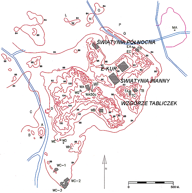 Badania dowiodły, że przy odkopanym zigguracie o nazwie E-kur (Ryc.3) prace budowlane wykonywane były przez pierwszych królów z III dynastii z Ur – Ur-Nammę oraz Szulgiego - a wykopany przez przekrój budowli szyb doprowadził do jeszcze wcześniejszych warstw z epoki wczesnodynastycznej (2900 – 2350 p.n.e.). Oprócz zigguratu odkryto dwie duże świątynie – Świątynia Inanny oraz Świątynia Północna – resztki pałacu, odkopano bibliotekę świątynną, która dostarczyła 20 tys. tabliczek oraz groby, w których chowano zmarłych po uprzednim częściowym spaleniu.
