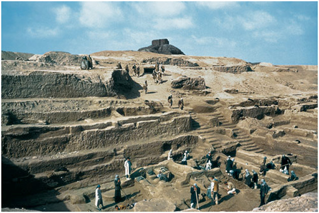 Pierwsze wykopaliska na terenie ruin zostały przeprowadzone w 1851 r. przez Austena Henry'ego Layarda. Kolejne przeprowadzono w latach 1888 – 1900 r i później szereg kampanii w latach 1948 – 1990 r. pod kierunkiem kolejno: Donalda E. McCowna, Richarda C. Hainesa, Jamesa Knudstada oraz M. Gibsona.