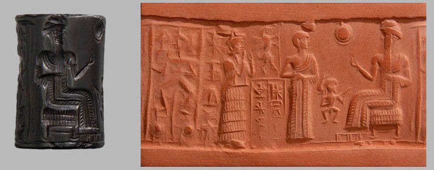 Pieczęć o wymiarach 2,4 cm x śr. 1,7, która miała dwóch właścicieli. Jej pierwotna kompozycja zawierała tzw. scenę prezentacji w stylu nowosumeryjskim, w której bóstwo opiekuńcze proteguje adoranta, uosabiająego właściciela pieczęci, ubóstwionemu królowi, siedzącemu na taborecie z podnóżkiem.